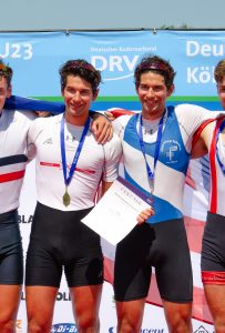 Unsere U23 Sportler Lukas und Julian Grimm behaupteten sich auch dieses Jahr wieder im Leichtgewichts Zweier ohne Steuermann, der technisch anspruchsvollsten Bootsklasse. Die beiden starteten als Renngemeinschaft Passauer Ruderverein/Regensburger Ruderklub. Im Bahnverteilungsrennen am Freitag schonten die Zwillinge ihre Kräfte und sicherten sich mit einem Zweiten Platz die Innenbahn für das Finale. Das Finale am Samstag hätte spannender nicht sein können. Gemeinsam mit den Gegnern aus dem Kieler Ruder-Club lieferten sich die Sportler ein hartes Kopf-an-Kopf-Rennen. Bei über 1500 geruderten Metern lagen die führenden Boote noch unter einer Sekunde zusammen. Über die letzten 500m behielten Lukas und Julian Grimm die Nerven und konnten sich in einem fulminanten Endspurt nach und nach von den Gegnern absetzen und so den Vorsprung auf vier Sekunden ausbauen. Mit über einer Bootslänge Vorsprung überquerten sie als erste die Ziellinie und gewannen im Leichtgewichts U23 Zweier ohne Steuermann den deutschen Meistertitel.