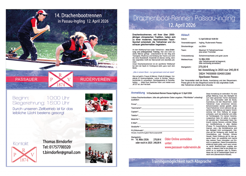 Seit dem Jahr 2007 startet am Sonntag nach dem Inn-River-Race das Passauer Drachenbootrennen. Beteiligt sind zahlreiche Mannschaften aus Stadt und Landkreis Passau. Firmen und Behörden stellen die zehn Mann starke Besatzung plus einen Taktgeber im Bug des Bootes. Die Boote werden dazu aus München geholt und von erfahrenen Steuerleuten betreut. Auf dem Vereinsgelände tummeln sich ca. 220 Aktive und zahlreiche Zuschauer. Bei Musik, Essen und Getränken ist im Bierzelt für alle Gäste bestens gesorgt.